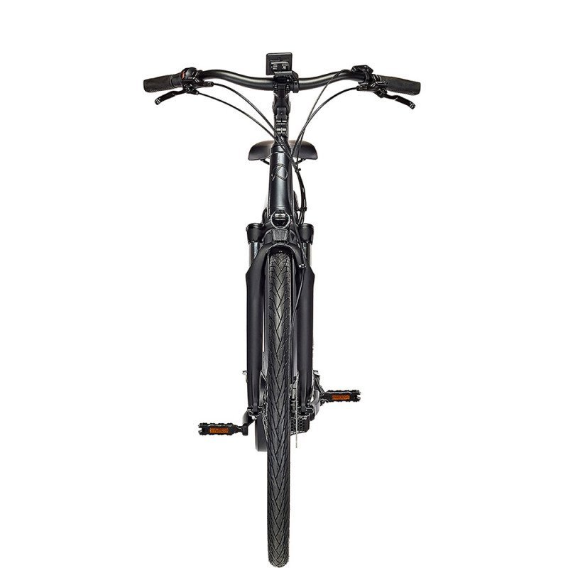 Que ce soit sur un trajet vélotaf de routine ou une rando légère, vous apprécierez la conduite tranquille et rassurante. La position droite n’impose pas trop de contrainte sur le dos et les cervicales. La selle large montée sur la tige à ressort soutient l’assise ; elle absorbe les secousses sur les pavés, les rails de tram, les ralentisseurs. Même chose à l’avant, avec la fourche télescopique Suntour NEX-E25, qui offre 63 mm de débattement. Le cockpit est composé d’un guidon recourbé et d’une potence à inclinaison variable ; vous bénéficiez d’une prise ergonomique sur mesure.