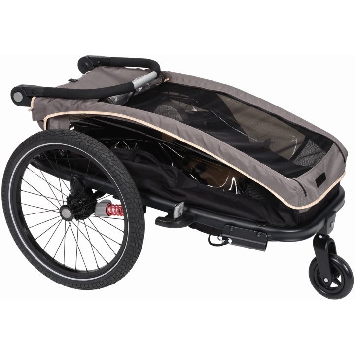 • monoplace, avec timon y compris attelage de remorque, fanion de sécurité, roue de buggy et barre de poussée réglable, capote anti-insectes et anti-intempéries,système de pliage innovant, frein de parking à pédale pour bloquer les deux roues, matériel réfléchissant, marquages de hauteur et de largeur.